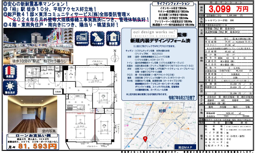 | 価格 | 3,099万円 | 維持費等 | 管理費 12,480円/月 修繕積立金 19,010円/月 |